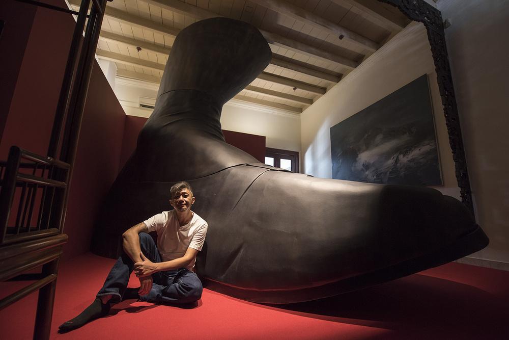 Most of the artworks are concentrated in a small apartment, accessible after scaling four flights of stairs in a narrow passageway many of us missed at first pass. There is also an element of surprise contained within this space, with visitors walking through a wardrobe to discover an inner passage taking them into the realm of the surreal. This space, akin to a dream sequence, contrasts vividly with the realistic evocation of a lived-in habitus of the rooms outside, with their disheveled cushions on the floor and cigarette butts in an ashtray.