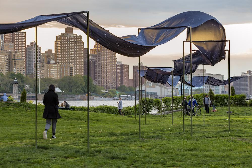 This installation consists of 29 panels of printed silk chiffon, representing a complete lunar cycle of 29 days, and depicts all phases of the moon beginning and ending with the new moon. The imagery is derived from Ando’s Moon Almanac, a series of 1345 small, natural indigo dye on washi paper drawings of the moon, created daily over 2.5 years of the Covid pandemic in New York City.